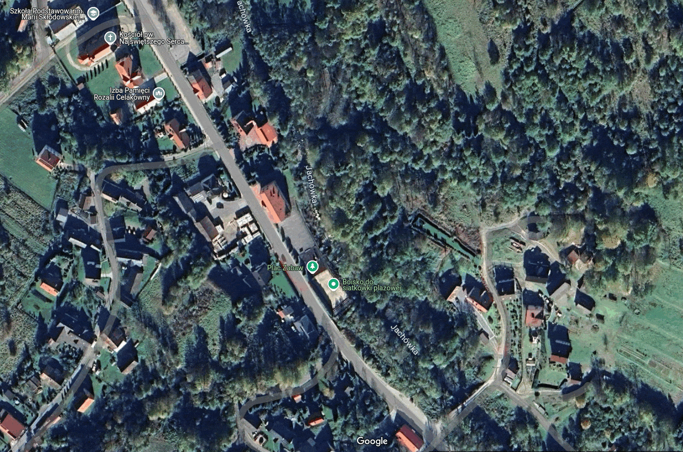 Poniżej znajduje się mapa pokazująca miejsce, gdzie niegdyś stał dom rodzinny Rozalii Celakówny.
